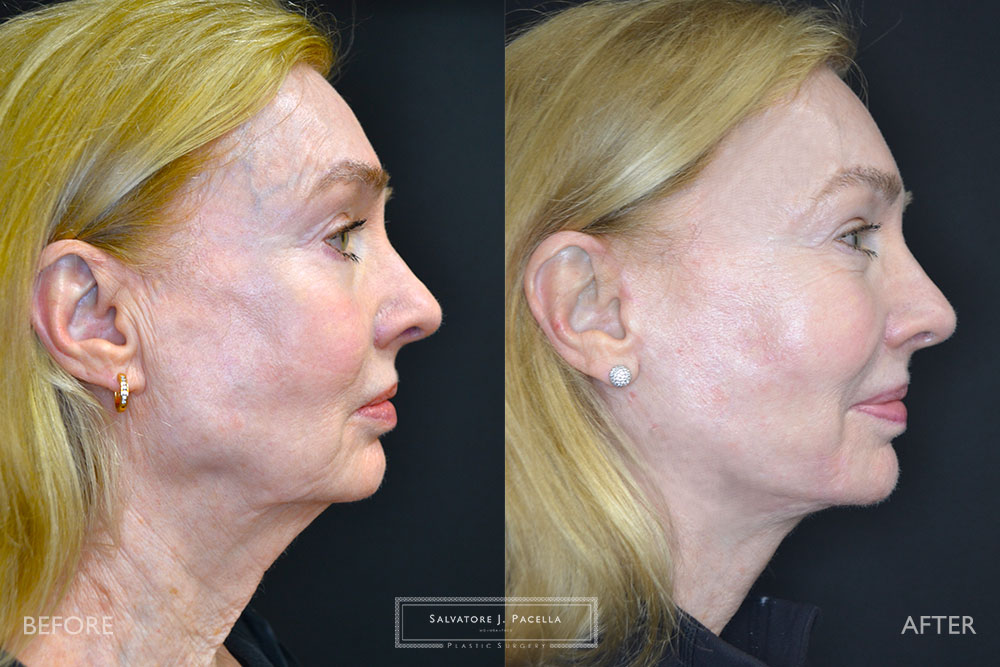 This elegant 71-year-old woman came to Dr. Salvatore Pacella seeking a comprehensive facial rejuvenation. She felt that her appearance no longer reflected the vitality she felt inside. Her main concerns included sagging in the cheeks and jawline, deep nasolabial folds, and loose skin in the neck.