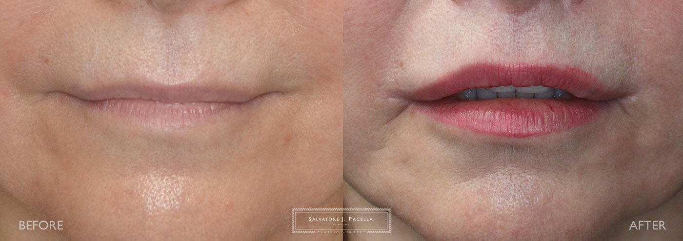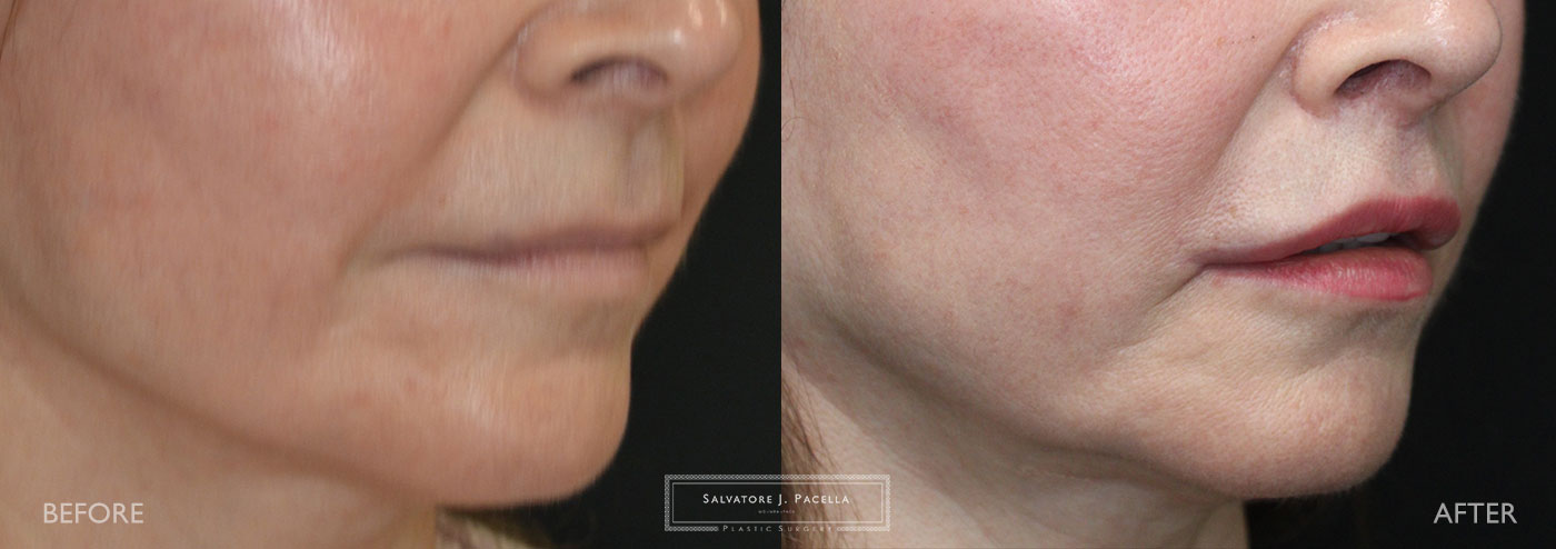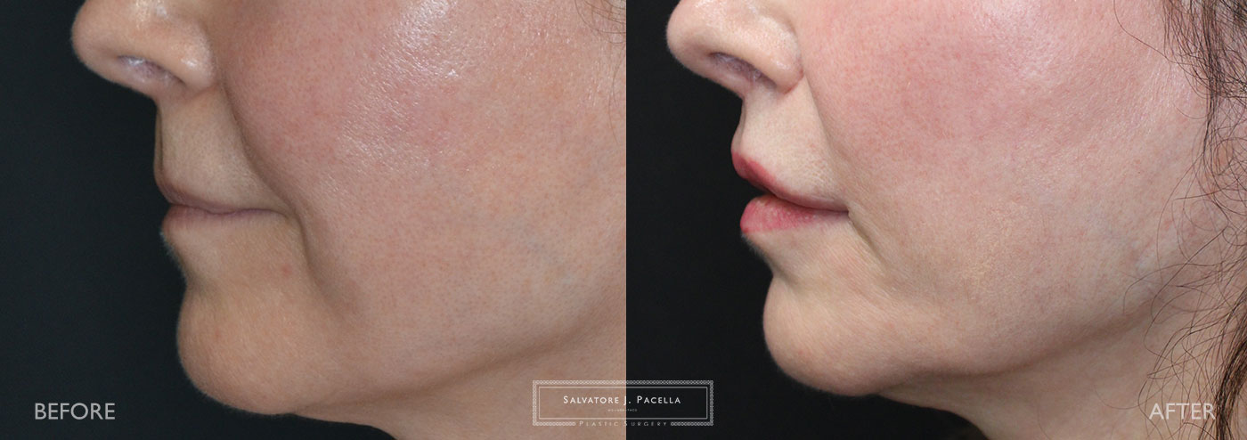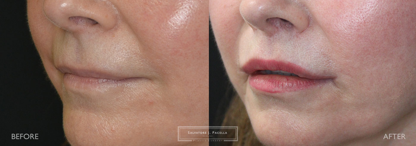 Dr. Salvatore Pacella performed a subtle, refined lip lift, carefully shortening the upper lip to restore ideal proportion and allow for natural central incisor tooth show. The goal was to enhance the facial harmony and femininity of her central face without creating an exaggerated or “overdone” appearance.