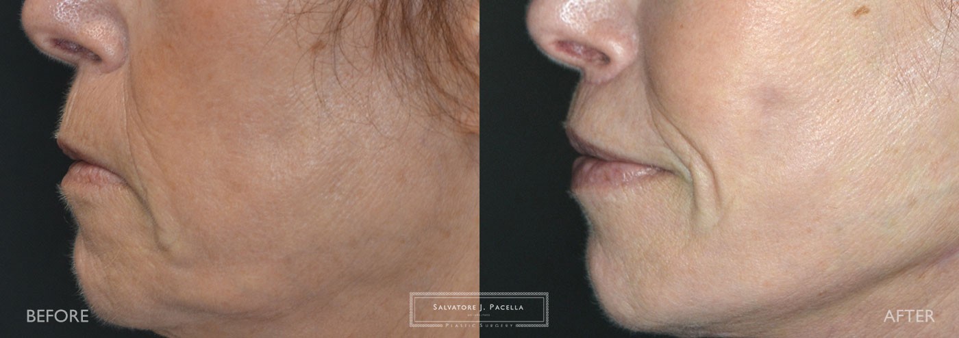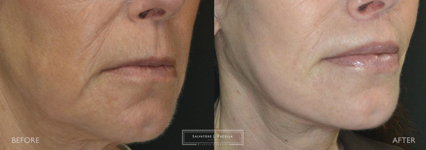 Dr. Salvatore Pacella performed a precise central lip lift, restoring this critical ratio and improving incisor show for a more vibrant, youthful appearance. He complemented this with fat transfer to the lips and surrounding perioral region to soften the contours, enhance volume, and round out the rejuvenated lip shape.