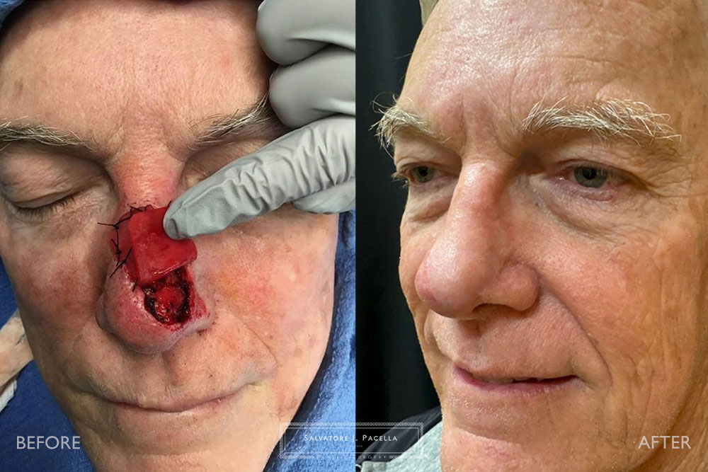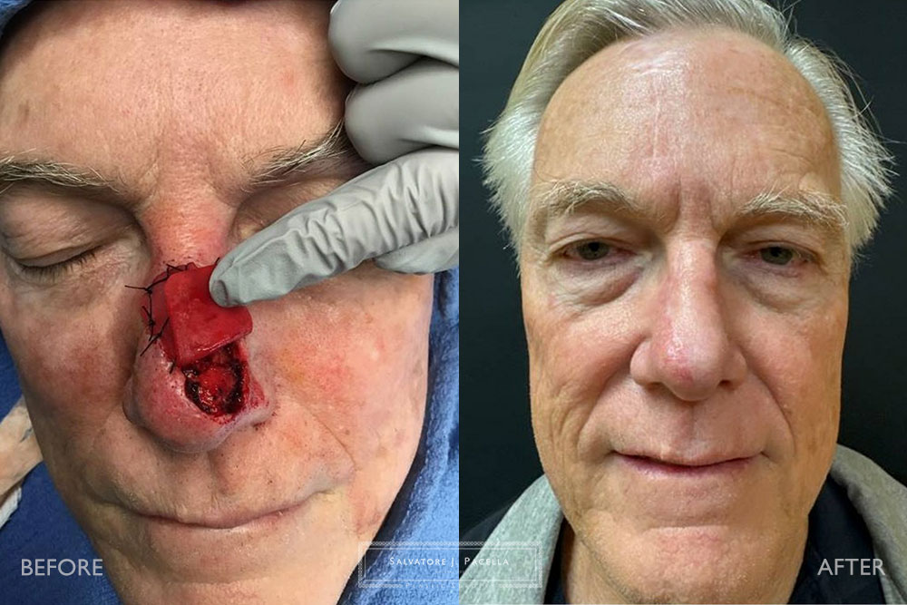 To reconstruct the nose, Dr. Salvatore Pacella — San Diego’s leading expert in facial and nasal reconstruction — performed a classic three-stage paramedian forehead flap, one of the most advanced techniques for complex nasal defects.
